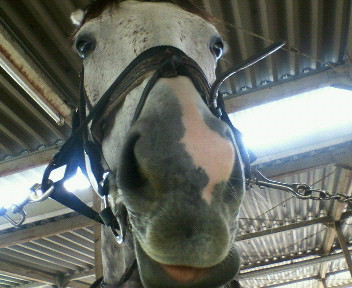 馬場中央に来ると穴を掘ることがある。人気があるので、いつも働いているイメージ。とにかく頑張りやで、乗り手の指示を理解してくれようとしているみたい。誘導も何もよく聞いてくれるが、水溜りに入るのは嫌らしく、水溜りをとおるように誘導すると、ジャンプして除ける見たいなのでびっくりする。