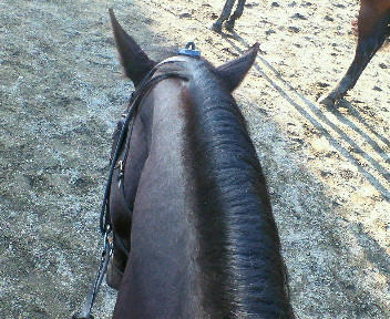 馬場でも、速歩が出にくい、あるいは出るまでに時間がかかるので、脚で効課なければ背中に合図を送ると比較的テンポ良く速歩が出るよう。