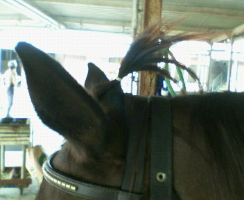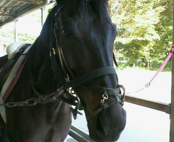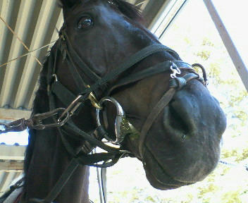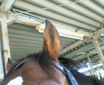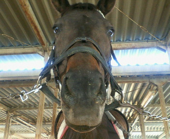 頭が低く、首が重いので駈歩させるときはよく頭を引っ張り上げないと駈歩が出ないのでがんばって引っ張る。首さえ持ち上げられればよく駈歩をだしてくれる。
