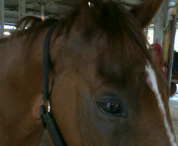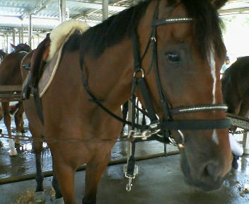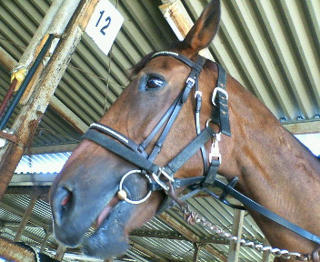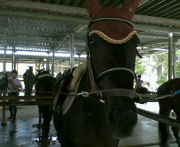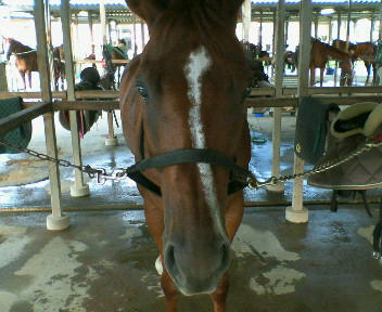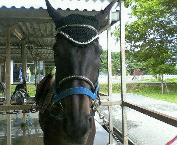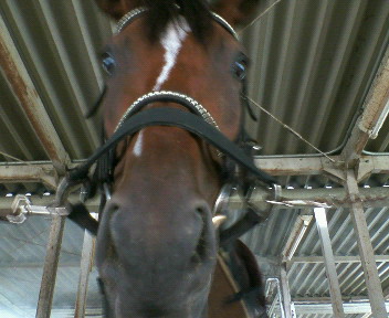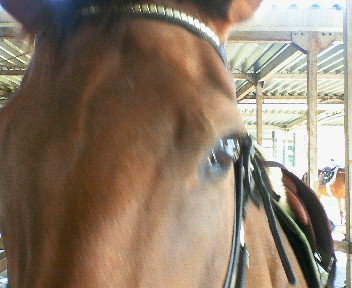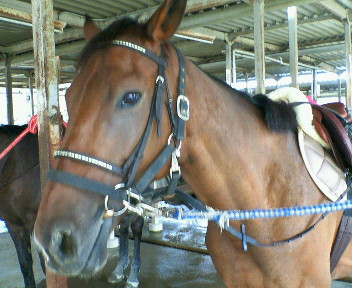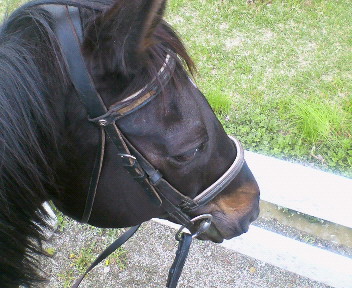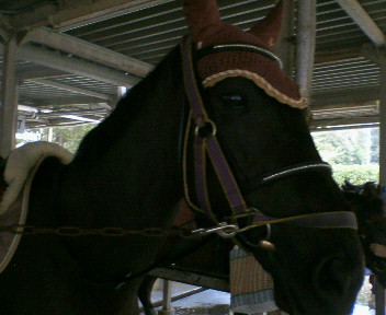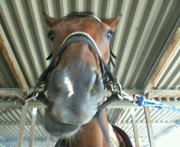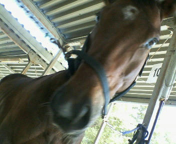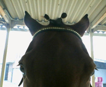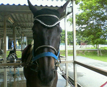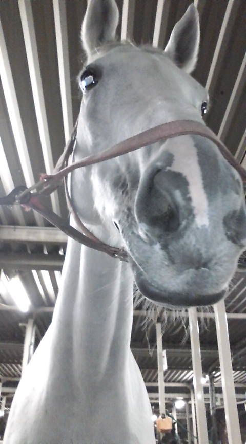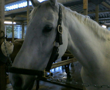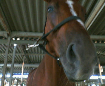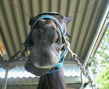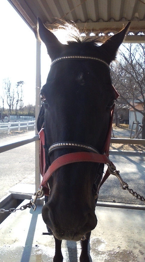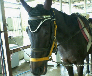 他の馬が大嫌いで、前をとおりすぎると、隣にくると、後ろの洗い場にはいると、その度に怒って威嚇しているので、馬装中の時は注意。人間は大好きらしい・・・。