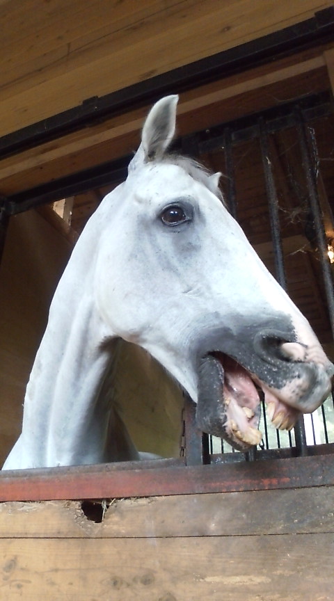 上の写真は、その講習会会場の乗馬クラブのにいた綺麗な白馬、ラルフちゃん。綺麗だけど、飼葉を配っているときで、早く食べたくて、この顔でアピール(苦笑)