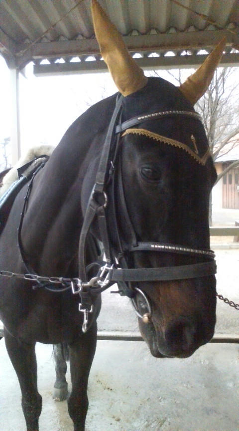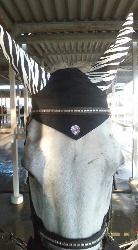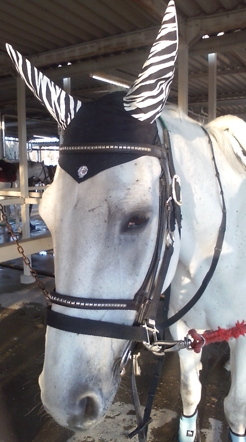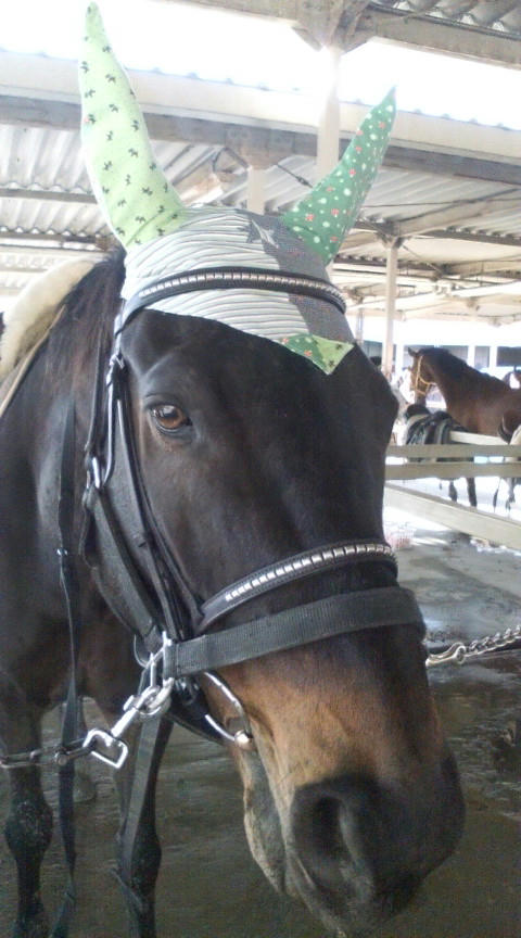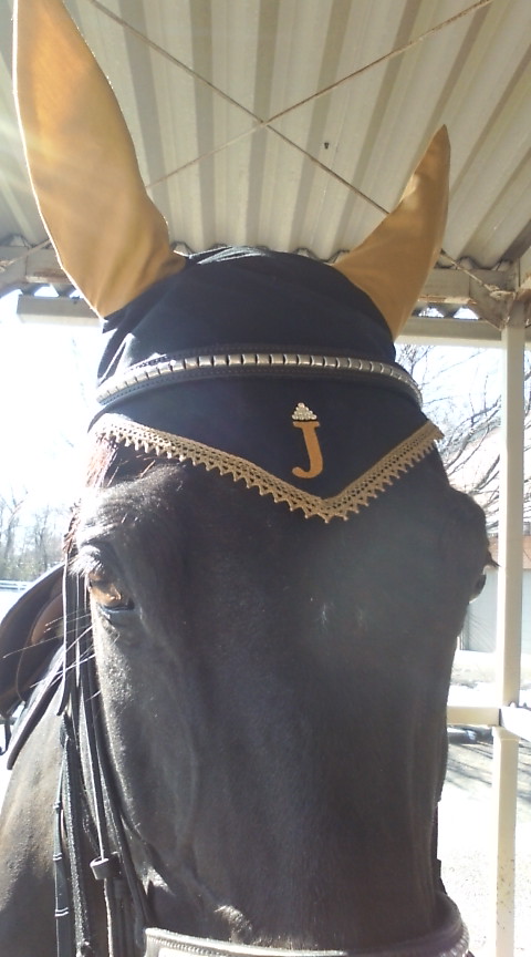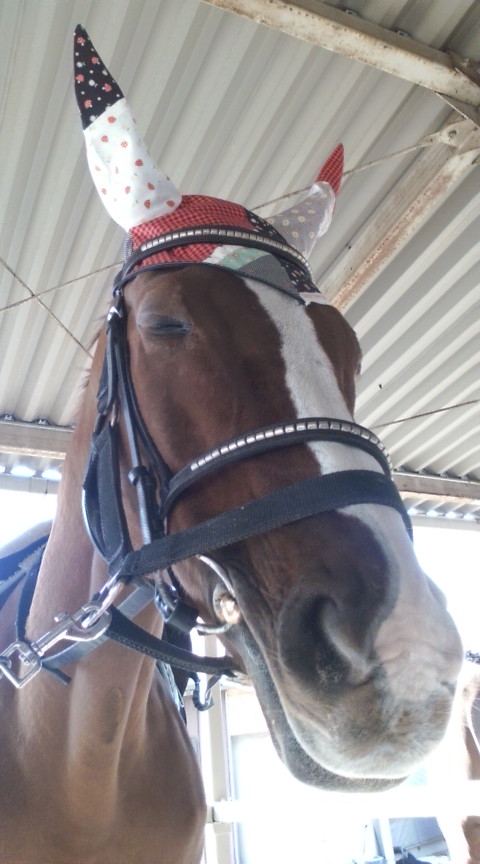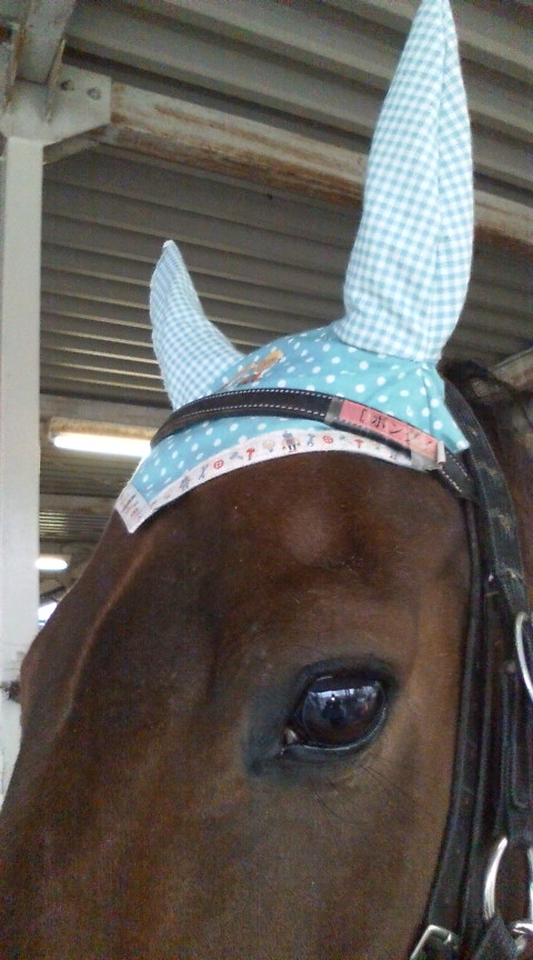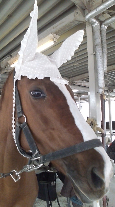 ジョー用のイヤーネット。黒鹿毛のジョーにはりりしいのが似合うなぁ・・と。