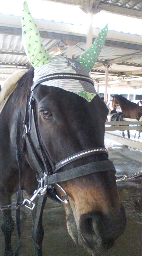馬装では、ボンちゃん、妙にご機嫌でどうしたんだろう・・・とおもっていましたら、そう、周りに馬がいない(笑)馬嫌いのボンちゃんは寒さでご機嫌、馬が近くにいなくてご機嫌です。